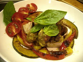 熱したフライパンにオリーブオイルを引いて、夏野菜を油に絡めて脇に寄せ、真ん中にチキンを並べて焼きます。野菜には軽く塩をふって、フタをして焼くだけ。(笑)