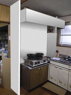 上から見ると、コンロを囲む「コ」の字型になるので、排煙効果が上がる事を期待しています。
