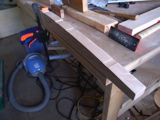 車体のルーフのフレームに合わせて、梁の上面を大きな曲線で切るわけですが、普通に丸鋸で曲線は切れません。なので、直線で多角形に切っていきます。