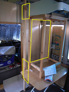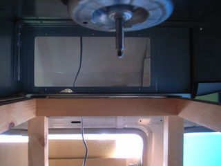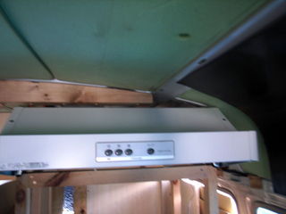レンジフードファンの排気口のための穴をボディーに開けなきゃ行けないんですが、そのためには、レンンジフードファンの正確な位置を確定せねばなりません。レンジフードファンは、背面の壁に突き当たるので、背面の壁の位置は、レンジフードファンに影響を受けます。レンジフードファンの排気口は、車体のフレームにかからない位置で通したいし、ご覧の通り、天井はアーチになって設置位置が制限されます。