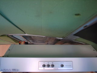 それらが出来て、レンジフードを仮設置し、正確なダクト穴を計測したあと、棚とレンジフードを取り外して、ダクト用の穴開け作業と言う流れになります。