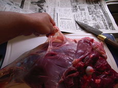 生憎、実家には、生肉を吊るすに好都合な場所などないので、速攻解体することにしました。